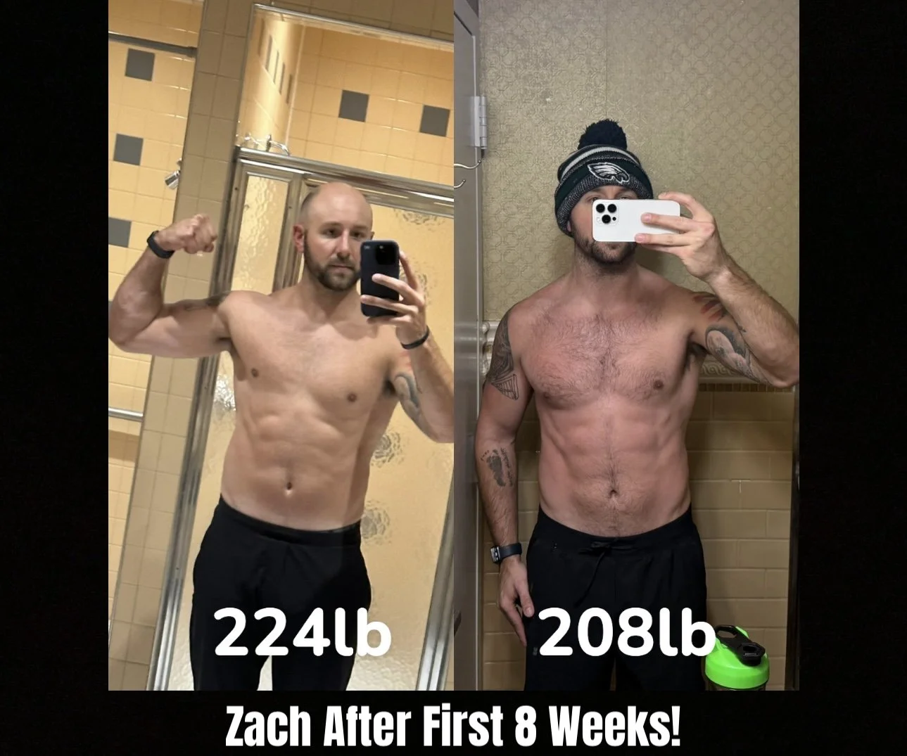 Zach, A former professional quarterback. Striving to take his body transformation to the next level. With eliminating the negatives from his diet plus critiques to his training, he also needed sombody to hold him accountable. With 1-on-1 coaching, he was able to cut down from 224 pounds to 208 pounds. "Feeling and looking the best I have since college."