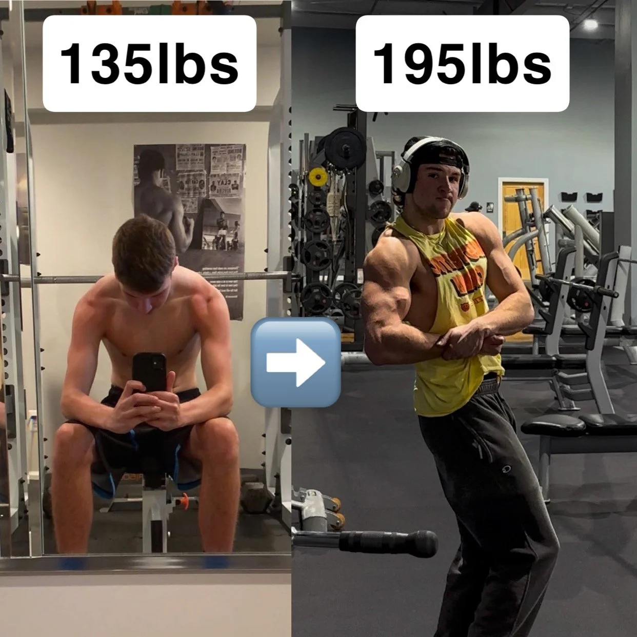 Dawson is a college football player who was looking to gain weight in the offseason. He was 6'3 180lb and after 16 weeks he put on 15 pounds while staying fast and athletic. From what felt to be impossible to gain weight, to reaching his goals and being the heaviest he has ever been.